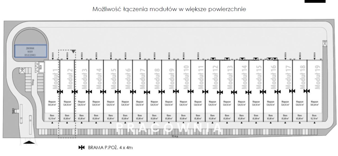 Przykładowa oferta pięciu modułów 5x 527 m2 (2635m2) oraz pomieszczeń biurowo-socjalnych 5x 85 m2 (425 m2).