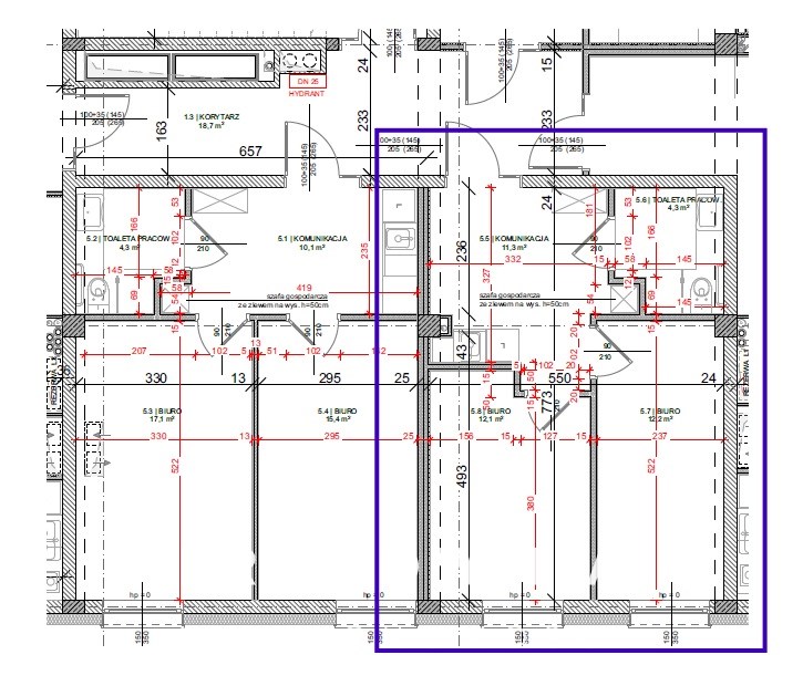 Powierzchnia lokalu 5B - to 39,9 m², w skład, którego wchodzą: biura o powierzchni 12,1 m² i 12,2 m², toaleta 4,3 m² oraz komunikacja – o powierzchni: 11,3 m².